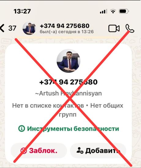 Տեղեկացնում ենք, որ WhatsApp հարթակում ստեղծվել է Շիրակի մարզպետի տեղակալ Արտուշ Հովհաննիսյանի անունով կեղծ օգտահաշիվ և տվյալ հեռախոսահամարից հաղորդագրություններ են ուղարկվում քաղաքացիներին ուգործընկերներին։