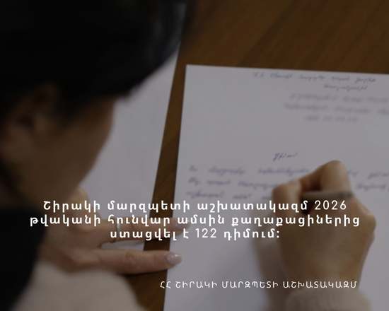 Շիրակի մարզպետի աշխատակազմ 2026 թվականի հունվար ամսին քաղաքացիներից ստացվել է 122 դիմում