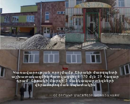 170 մլն 29 հազար դրամ գումարը հատկացվել է Շիրակի մարզպետի աշխատակազմին՝ Գյումրու 2 մանկապարտեզների և Անի համայնքի Սառնաղբյուրի մանկապարտեզի հիմնանորոգման համար։